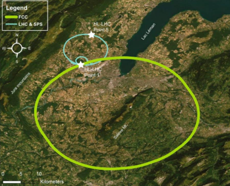 Figure: The proposed FCC ring layout of 100km in green (large) and its predecessors LHC/HL-LHC hosted in the existing 27km tunnel (small) both in blue (REF)